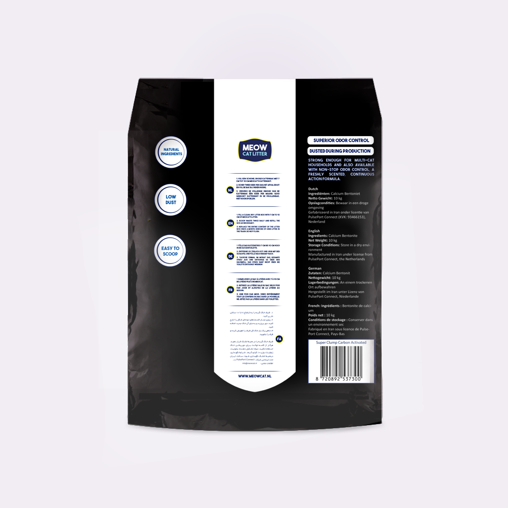 خاک گربه «گرانول کربن فعال و زئولیت»، ۱۰۰٪ غیر سمی است و بو و رطوبت موجود در دفع گربه شما را به خود جذب میکند. «زئولیت» یک ماده معدنی آتشفشانی طبیعی است که دارای منافذ ویژهای برای جذب مایعات و بو است که مانند تله عمل میکند و بو را در منافذ خود نگه میدارد. «کربن» نیز باعث میشود تا میزان جذب بوی بد چندین برابر شود. این محصول آنتیباکتریال و ضد حساسیت است و غبارگیری شده است. در فرآیند تولید این محصول از هیچ ماده شیمیایی استفاده نشده است و تماما از مواد طبیعی تولید شده است.